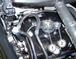 Remove the ht leads (1), unscrewing the nuts (2) of both spark plugs.