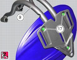Fit the vibration dampers (15) in the corresponding holes of the number plate holder plate (8). Position the splashguard (16) on the number plate support subframe (9).